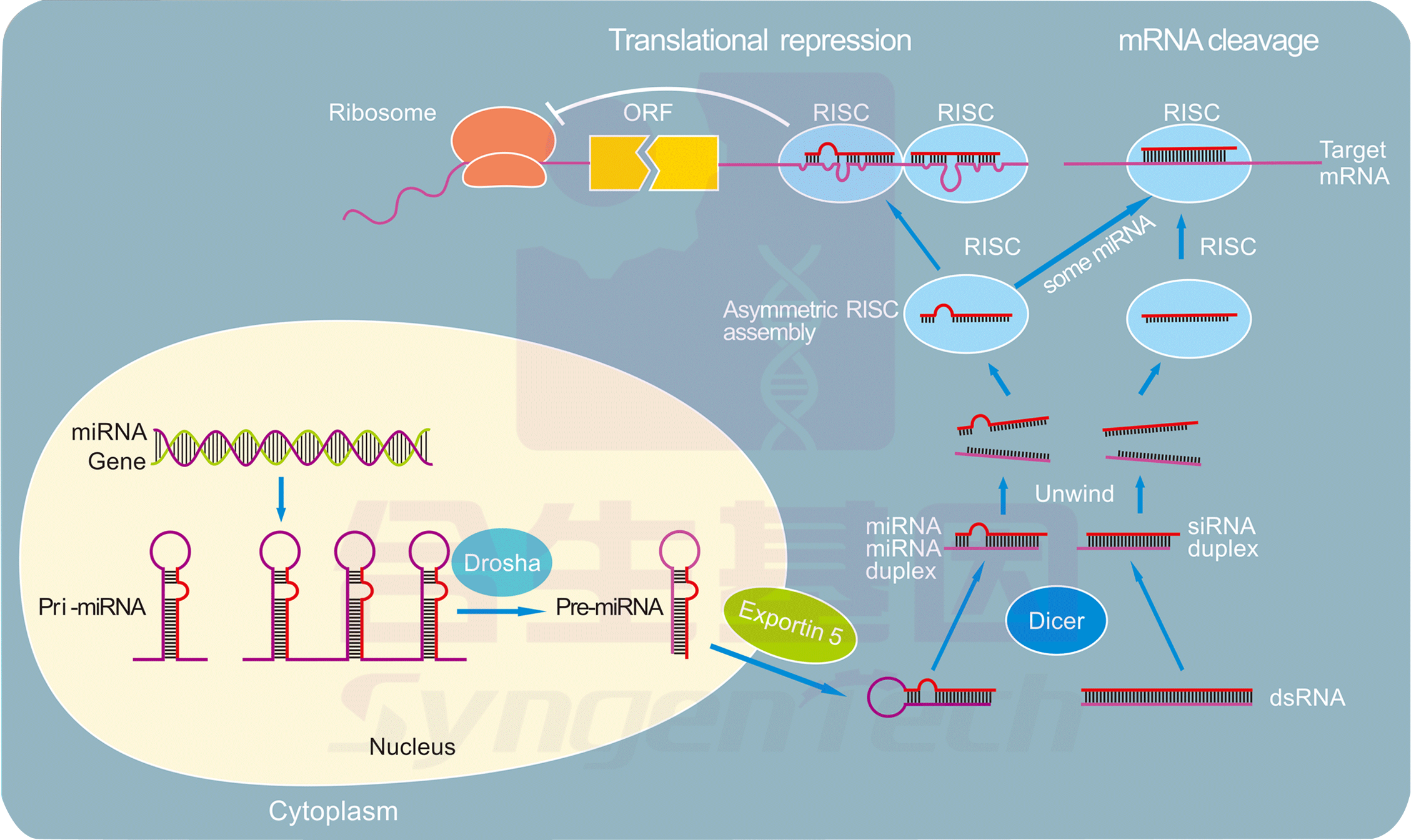 MicroRNA存在多种形式,最原始的是pri-miRNA,长度大约为300~1000个碱基;pri-miRNA经过一次加工后,成为pre-miRNA即microRNA前体,长度大约为70~90个碱基;pre-miRNA再经过Dicer酶酶切后,成为长约20~24nt的成熟miRNA。