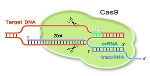 Cas9蛋白(含有两个核酸酶结构域,可以分别切割DNA两条单链。Cas9首先与crRNA及tracrRNA结合成复合物,然后通过PAM序列结合并侵入DNA,形成RNA-DNA复合结构,进而对目的DNA双链进行切割,使DNA双链断裂。