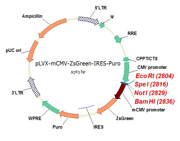 过表达慢病毒载体,带绿色荧光和嘌呤霉素抗性