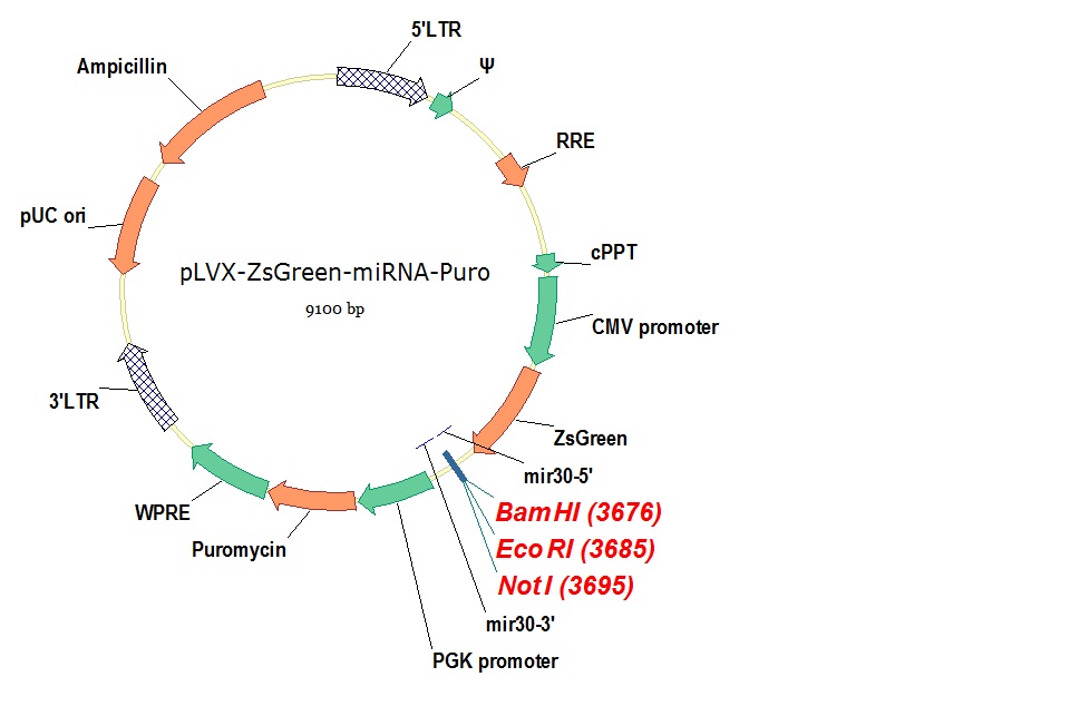 microRNA慢病毒载体,带绿色荧光和嘌呤霉素抗性
